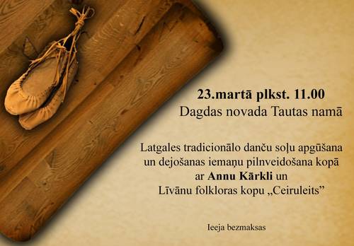 Dagdys nūvoda tautys nomā 23. martā 11 stuņdēs sevkurs interesents varēs apgiut senūs Latgolys daņčus. Daņči nūtiks Annys Kārklis i Leivuona folklorys kūpys „Ceiruleits” vadeibā. Nūdarbeibys byus bez moksys, seikuoku infromaceju var sajimt pa telefonu 26123157 (Inta).