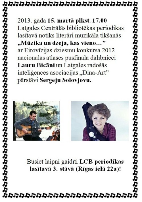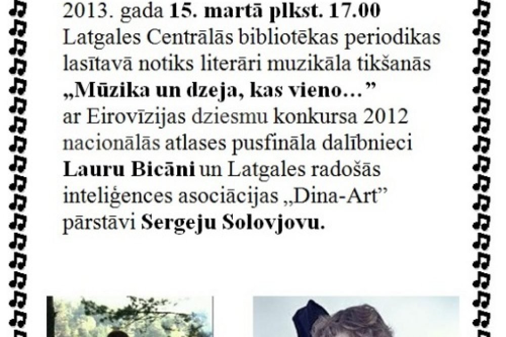 Pīktdiņ 17 stuņdēs Daugovpilī Latgolys Centraluos bibliotekys periodikys skaiteitovys 3. stuovā nūtiks literari muzykala tikšonuos „Mūzika un dzeja, kas vieno…” ar Eirovizejis dzīšmu konkursa 2012. goda nacionaluos atlasis pusfinala daleibnīci latgalīšu dzīsmineici Lauru Bicāni i Latgolys rodūšuos inteligencis asociacejis „Dina-Art” puorstuovi Sergeju Solovjovu. Muziki atguojušūs prīcēs ar dzīsmem, stuosteis par sovim rodūšajim nuokūtnis planim, kas radeis jauku i pavasareigu atmosfēru.