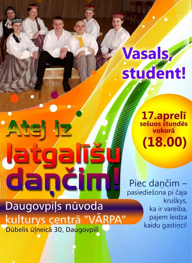 Pavasars ir laiks, kod gribīs fiziskys aktivitatis, ka nav laika skrīt ci īt iz sporta zalu, lobs rysynuojusm ir daņči. Byus lobuok ļustēt, ka kuojuos byus ārtys kūrpis i kerzinē kaids gordums, kū dakūst pi čaja, ka doncojūt energejis apsatryukst. Iz daņčim tiks gaideits 17. aprelī 18:00 stuņdēs Daugovpiļs nūvoda kulturys centrā “Vārpa”.
