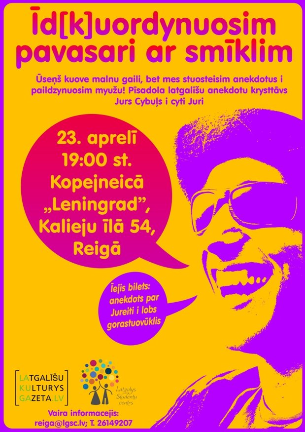 Kab ar smīklim īskandynuotu pavasari i īleiksmuotu sirdi, bīdreibys „Latgolys Studentu centrs” Reigys kūpa 23. aprelī svieteis Jura dīnu i 19:00 stuņdēs kopejneicā „Leningrad”, Kalieju īlā 54, reikuos latgalīšu anekdotu stuosteišonys turniru „Īd[k]uordynuosim pavasari ar smīklim”.