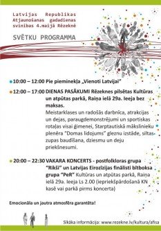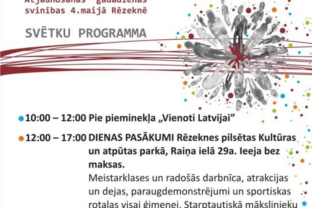 Par gūdu Latvejis Republikys Naatkareibys atjaunuošonys godadīnai 4. majā Rēzeknē tiks pīduovuota plaša svātku programma, kas pīseitynuota ar muokslys i rodūšuma gaisūtni. Nūtiks dažaidi pasuokumi muzejā, kulturys nomūs, pi pīminekļa „Vienoti Latvijai”, Kulturys i atpyutys parkā.