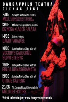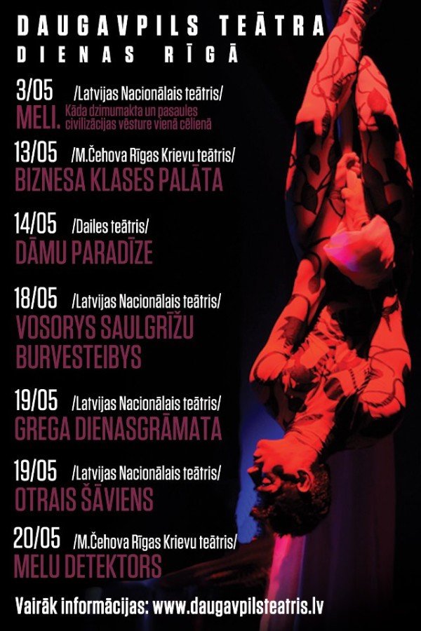 Nu 3. maja leidz 20. majam Reigā nūtiks Daugavpiļs teatra dīnys, kuru laikā vairuokūs Reigys teatrūs byus īspieja nūsavērt Daugavpiļs teatra jaunuokūs i īcīneituokūs īstudiejumus, kūpumā 7 izruodis latvīšu, krīvu i latgalīšu volūduos.