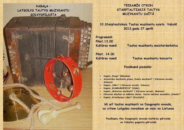 13 stuņdēs Vabalis kulturys nomā nūtiks tautys muzykantu meistardarbneica, bet 14 stuņdēs – tautys muzykantu koncerts. Pasuokumā pīsadaleis kapelys „Dziga”, „Sābri”, „Bumburneicys”, „Malnavas muzikanti”, „Kreicburgas ziķeri”, muzykantu grupa „Danču muzikanti”, tautys muzykys ansamblis „Dimdari”, kai ari byus gosti nu cytim Latgolys nūvodim i Lītovys.
