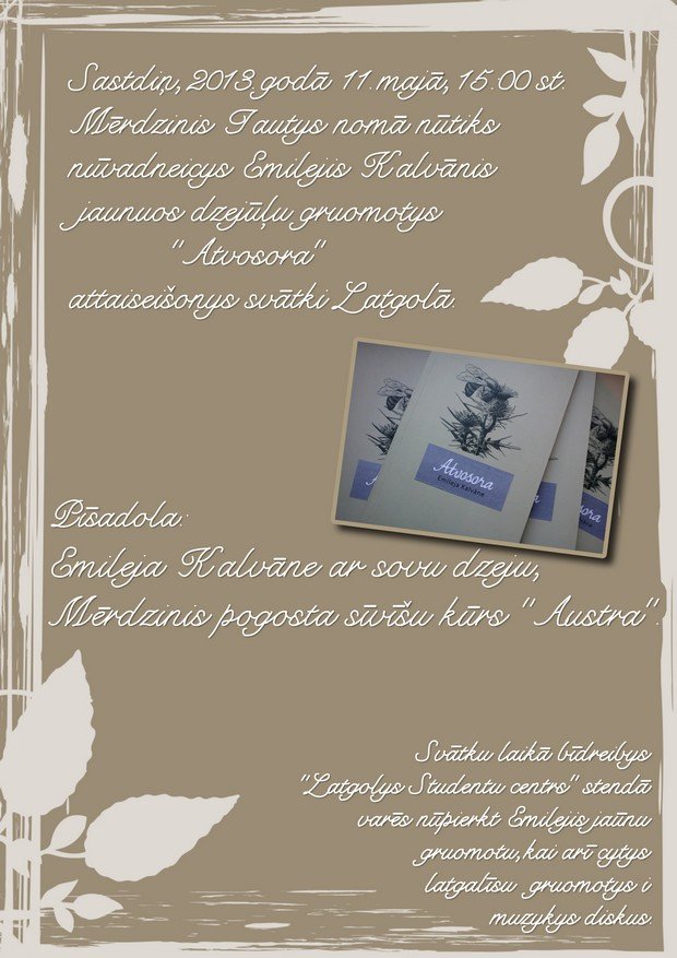 Sastdiņ, 11. majā, 15 stuņdēs Mērdzinis Tautys nomā nūtiks dzejneicys Emilejis Kalvānis ūtruos gruomotys „Atvosora” attaiseišonys svātki. Pasuokumā ar dzejūlim pīsadaleis dzejneica Emileja Kalvāne i ar dzīsmem – Mērdzinis pogosta sīvīšu kūrs „Austra”. Pasuokuma laikā dorbuosīs Latgolys Studentu centra gruomotu golds, kur varēs nūpierkt jaunū gruomotu, kai ari cytys latgalīšu gruomotys i muzykys diskus.