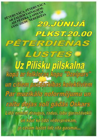 Redzēt tū, kaidys ir Pīterdīnys tradicejis, kai ari jamuos pīsadaleit varēs 29. junī Vuorkovys nūvodā, Pilišķu piļskolnā. Vysi interesenti ir gaideiti nu 20 stuņdem iz Pīterdīnys ļustem kūpā ar folklorys kūpu „Dzeipurs” i cytim pošdarbeibys kolektivim, byus padūmuots ari par muzykalū nūformiejumu. Leidza juojam draugi, rodi, lobs gorastuovūklis i koč kas vārdarprīkam, partū ka īcarāts ļustēt leidz reitam.