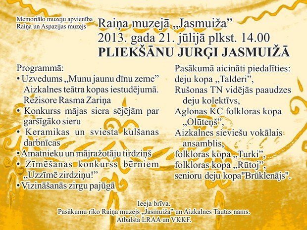 Lai atzeimātu Plīkšānu īīšonu Jasmuižā pyrma 130 godim, 21. julī 14 stuņdēs Preiļu nūvoda Aizkalnē Jasmuižys breivdobys estrādē nūtiks pasuokums „Pliekšānu Jurģi Jasmuižā”. Pasuokumā planavuota plaša kulturys programma i dažaidys aktivitatis. Aizkaļnis teātra kūpa ruodeis uzvadumu „Munu jaunu dīnu zeme” (režisore Rasma Zariņa) par jaunuo Raiņa dzeivi tāva nūmuotajā muižā.