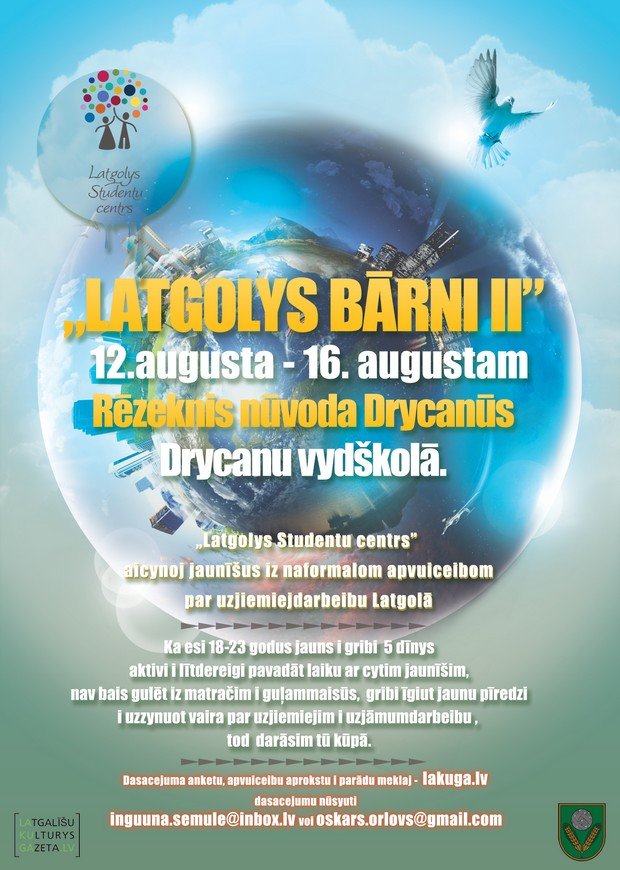Bīdreiba „Latgolys Studentu centrs” aicynoj jaunīšus iz naformalom apvuiceibom „Latgolys bārni II” par uzņiemiejdarbeibu nu 12.augutsa leidz 16. augustam Drycanu vydškolā. Ka esi 18-23 godus jauns i gribi 5 dīnys aktivi i lītdereigi pavadeit laiku ar cytim jaunīšim, īgyustūt jaunu i naradzātu saskarsmi ar i par uzņiemiejim, tod dareisim tū kūpā.