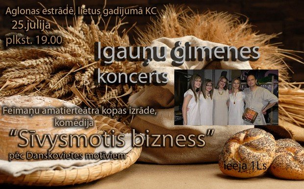 Aglyunā 25. julī 19:00 izskanēs muzykaluo šova „Dziedošās ģimenes” dalinīku Igauņu saimis koncerts, bet Feimaņu amaterteatris izruodeis piec Danskovītis lugys motivim taiseitū aizraujūšū stuostu – komedeju „Sīvysmuotis bizness”.