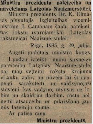Publicāts laikrokstā „Sauleite” 1935. goda 1.septembrī