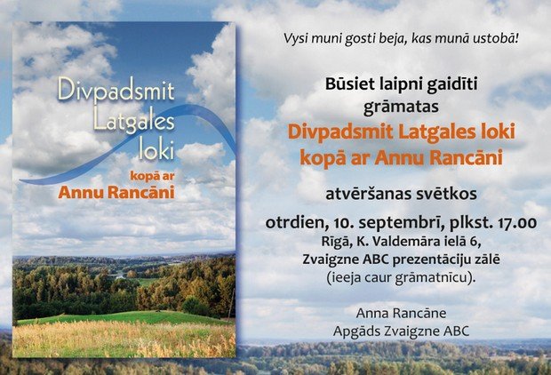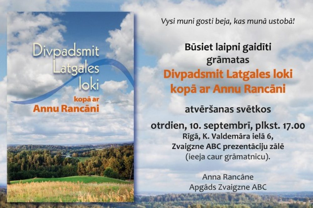 Reigā izdevnīceibys “Zvaigzne ABC” prezentaceju zalā K. Valdemāra īlā 6 10. septembrī 17:00 tiks prezentāta Annys Rancānis jaunuokuo gruomota “Divpadsmit Latgales loki kopā ar Annu Rancāni”.