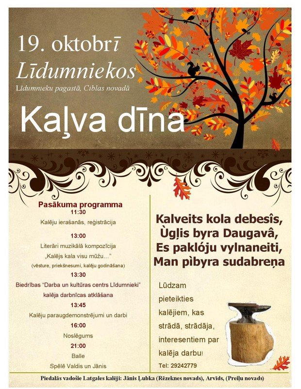 19. oktobrī Cyblys nūvoda Leidumnīku pogostā tiks svieteita Kaļva dīna. Pasuokums suoksīs 11:30, bet ap 13:00 sanuokušūs prīcynuos literari muzykala kompoziceja „Kalējs kala visu mūžu..”. 13:30 tiks atkluota bīdreibys „Darba un kultūras centrs Līdumnieki” kaļva darbneica. Varēs vērtīs ari kaļvu paraugdemonstriejumus. Bet vokorā byus bals, spēlēs Valdis i Juoņs.