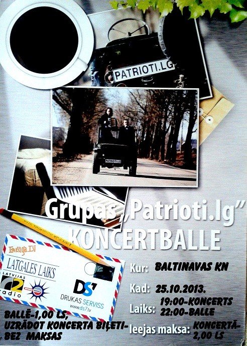 Baļtinovys kulturys nomā 25. oktobrī nūtiks šlagergrupys „Patrioti.lg” koncertbals. Koncerts suoksīs 19:00, bet bals – 22:00. Koncertā īejis moksa 2,00 Ls, balā – 1,00 Ls, bet, paruodūt koncerta beletu, – bez moksys.