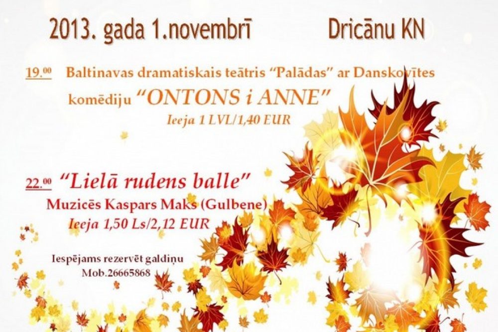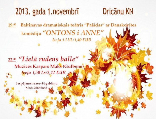 Piec teatra vokorā 22:00 bals „Lielā rudens balle”, muzicēs Kaspars Maks (Gulbene). Īeja 1,50 LVL/2,12 EUR. Gaļdeņus var īprīkš rezervēt pa tel. 26665868.