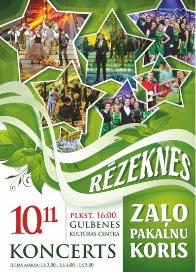 Šova „Koru kari” uzvarātuojs Rēzeknis Zaļūs pokolnu kors prīcēs klauseituojus 10. novembrī Gulbenis kulturys centrā 16:00. Īejis moksa pasuokumā 3 leidz 5 lati.