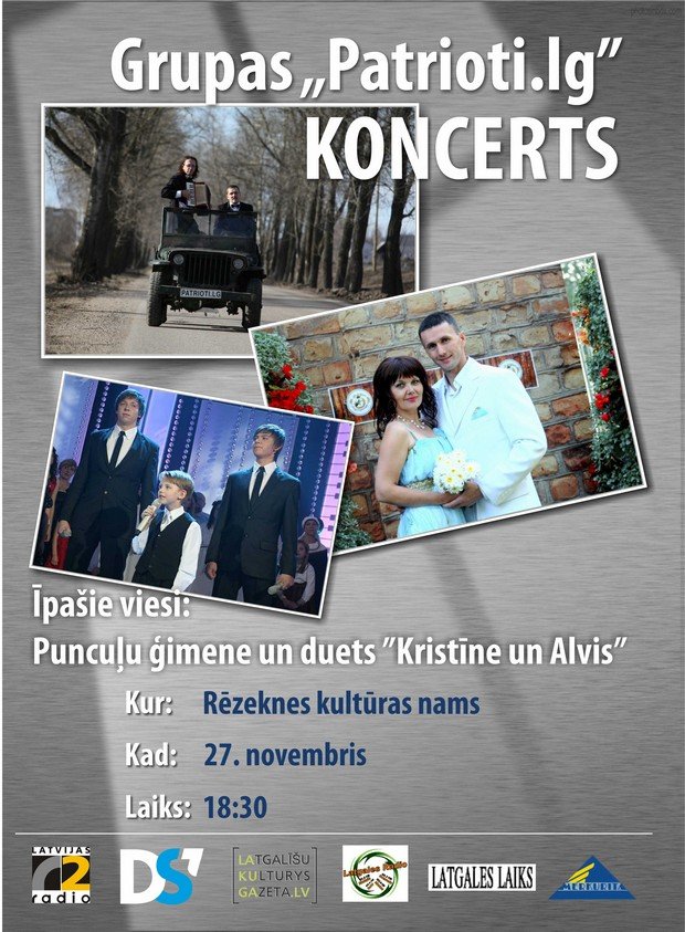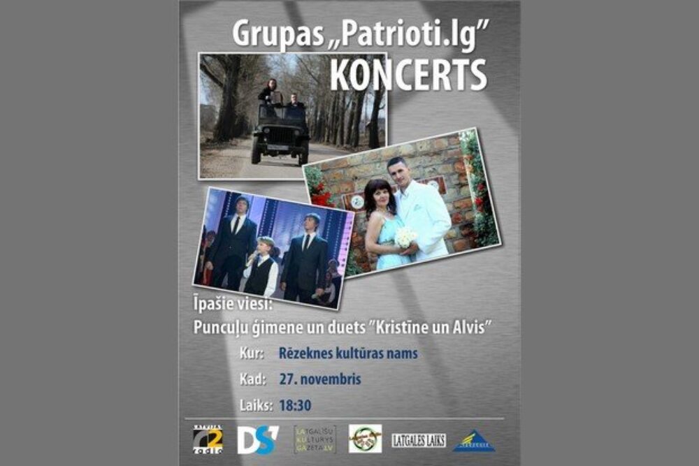 Grupa „Patrioti.lg” aicynoj iz koncertu sovā dzymtajā piļsātā – Rēzeknē 27. novembrī 18:30 Rēzeknis kuļturys nomā. Koncertā izskanēs gon zynomuos grupys dzīsmis, gon pyrmatskaņuojumi. Grupys dalinīki Jurs Ostrovskis i Artūrs Uškāns prīcēs klauseituojus ari ar dzīsmem nu sovim solo projektim. Koncertā uzastuos ari grupys draugi – šova „Dziedošās ģimenes” uzvarātuoji Puncuļu saime i romantiskais duets Kristīne i Alvis.