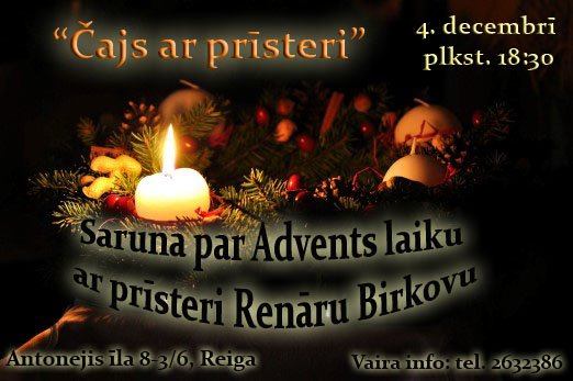 Suocīs Adventa laiks. Sajiuta, ka skriejīni gribam padareit lānuoku, dzīsmi klusuoku i dūmys apcereiguokys. Bet kaidi ir Advents laika pyrmsuokumi, kas vēļ jimā byutu juodora ci tīši pretieji – nabyutu?! LgSC Reigys birojs aicynoj iz sarunu par Advents laiku jaunū katūļu prīsteri Renāru Birkovu. 4. decembrī 18.30 stuņdēs sasatiksem, īdzersim čaju un mieginuosim saprast, kai i kaidym byut itymā laikā.