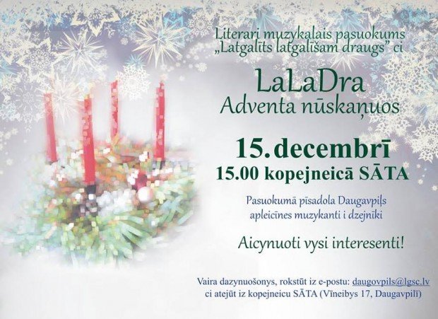 Bīdreiba „Latgolys Studentu centrs” sadarbeibā ar kopejneicu SĀTA 15.decembrī, 15.00 reikoj literari muzykalū pasuokumu „Latgalīts latgalīšam draugs” ci LaLaDra.
