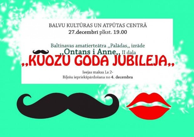 27. decembrī Bolvu Kulturys i atpyutys centrā gasteis Baļtinovys dramatiskais kolektivs „Palādas” ar izruodis “Ontons i Anne” II daļu “Kuozu goda jubileja”. Suokums 19:00, biļeta cena 2 LVL.
