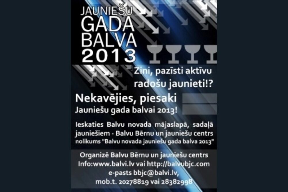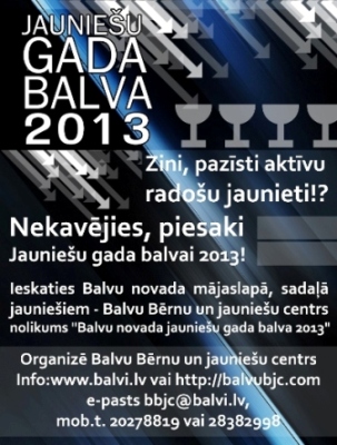 Bolvu Bārnu i jaunīšu centrs izsludynuojs pīsasaceišonu Bolvu nūvoda Jaunīšu goda bolvai 2013, kurys nūslāguma pasuokums nūtiks 31. janvarī Bolvu Tuoļuokizgleiteibys i cylvākresursu atteisteibys centrā.