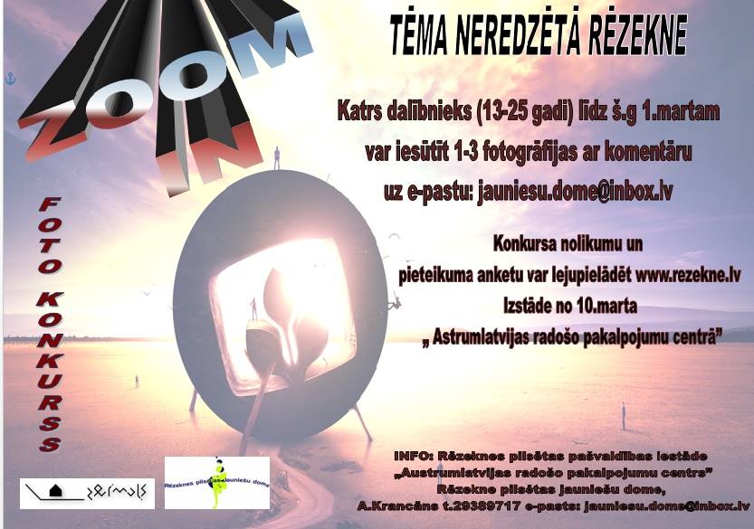 Rēzeknis piļsātys jaunīši vacumā nu 13 leidz 25 godim aicynuoti pīsadaleit tradicionalajā jaunīšu fotokonkursā-izstuodē “ZOOM-IN”. Itūgod fotokonkursa tema ir “Neredzētā Rēzekne”. Sovuos karteņuos jaunīši var atspūguļuot vysaidys sadzeivis voi dobys ainovys nu Rēzeknis piļsātys, kurys kasdīnā cylvāki naīvāroj.
