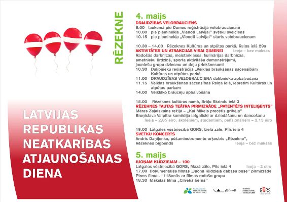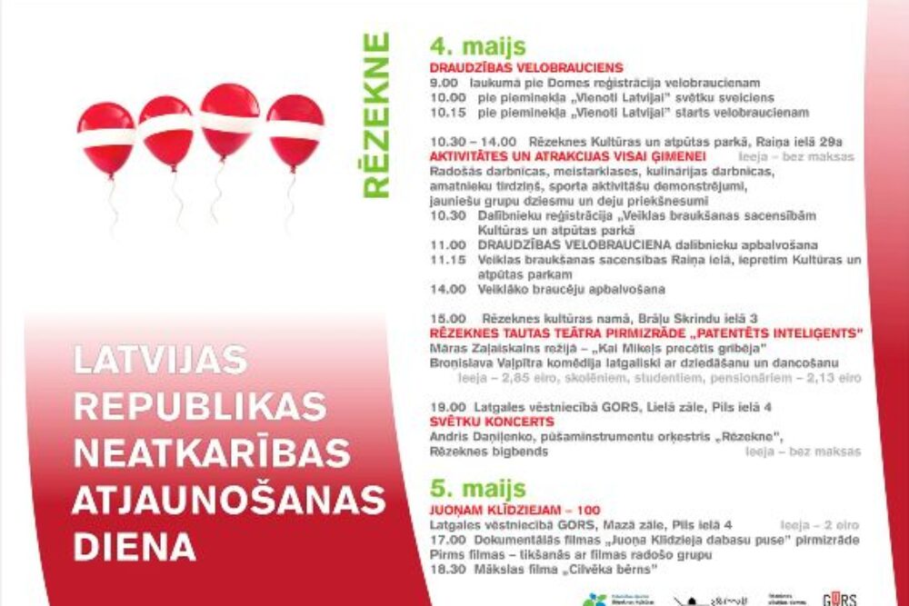 Latvejis Republikys Naatkareibys atjaunuošonys dīnā, 4. majā, Rēzeknē itūgod nūtiks Draudzeibys velobraucīņs i aktivitatis vysai saimei breivā dobā, byus ari Rēzeknis Tautys teatra pyrmizruode i svineigs svātku koncerts.