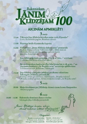 Atceris pasuokumu cikls suoksīs sastdiņ, 3. majā 12.00 Juoņa Klīdzieja bierneibys sātys vītā “Upmaļūs” Kantinīku pogosta Lyužā, sovukuort 13.00 sevkurs interesents byus gaideits iz pīminis breidi Kantinīku kopsātā. Rakstnīka symtgadei veļteitī pasuokumi turpynuosīs Fraņča Trasuna muzejā “Kolnasāta” Sakstagolā, kur nūtiks Klīdzieja pruotulu gruomotys “Viss ir uz labo…” atvieršona (gruomotys sastateituoja Ināra Ducsaliete), kai ari bārnu dūmrokstu konkursa “Par labu bērnu būt ir tik grūti…” i zeimiejumu konkursa “Ar Boņuka acīm” uzvarietuoju apbolvuošona.