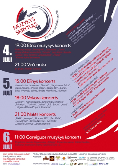Daugovpiļs nūvoda Leiksnā nu 4. leidz 6. juļam jau pīktū reizi nūtiks leluokais latgalīšu muzykys festivals “Muzykys Skrytuļs”, treis dīnu laikā pīduovojūt sešus dažaidus koncertus, kurūs kūpā pīsadaleis ap 300 muziku. Festivala centralū nūtykumu veidoj treis jaunuos latgalīšu muzykys koncerti sastdiņ, 5. julī — lelajā sajiutu dīnā —, kod iz skotuvis kuops i jaunys grupys, i zynomi muziki — Kārlis Kazāks, grupys “Dabasu Durovys”, “Borowa MC”, “Bez PVN”, Eriņu i Vuorkaļu saime, “Latgolys Dāmu Pops” i daudzi cyti.