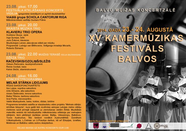 24.augustā 16.00. Kamermuzykys festivala nūslāguma koncerts “MELNĀ STĀRĶA LIDOJUMS”. Pīsadola: “RĪGAS SAKSOFONU KVARTETS”: Ilze Lejiņa, soprana saksofons, Artis Sīmanis, alta saksofons, Ainars Šablovskis, tenora saksofons, Baiba Tilhena, baritona saksofons, Ieva Parša /mecosoprans/, Valdis Muktupāvels /bolss, kūkle, dūdys, birbīne/.