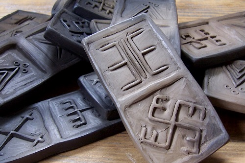 Latgolā nu muola teik veiduota domino spēle ar latvju rokstu zeimem