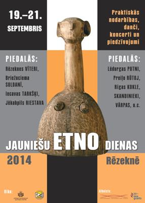 Nu 19. leidz 21. septembram Rēzeknē nūtiks nūmetne “Jaunīšu Etno dīnys 2014”, kur sovys zynuošonys folklorā i etno muzykā papyldynuos jaunīši nu vysys Latvejis.