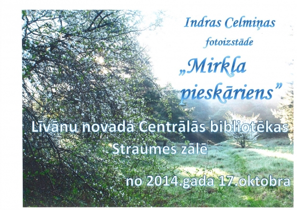 17.oktobrī, vālā piecpušdīnē, Leivuona nūvoda Centraluos bibliotekys zalā “Straumes” skateituoju viertiejumam tiks nūdūta Indrys Celmenis fotoizstuode “Mirkļa pieskāriens”, kas interesentus prīcynuos leidz pat goda beigom.