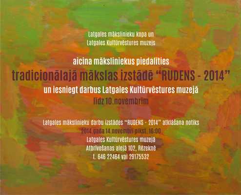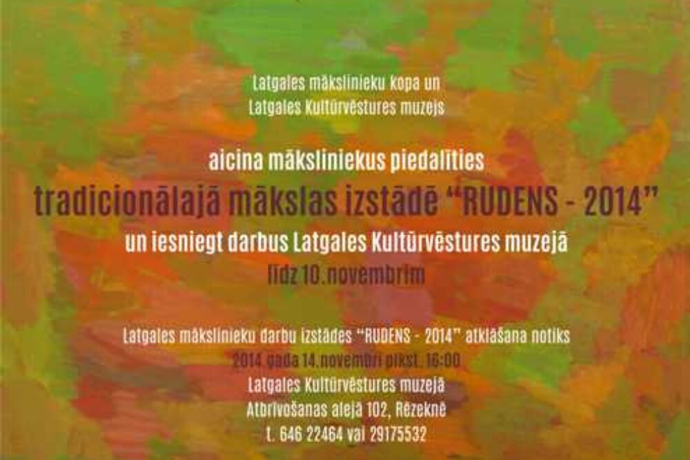 Latgolys Kulturviesturis muzejs i Latgolys muokslinīku kūpa 19. godu piec kuortys aicynoj Latgolys profesionalūs, aktivi struodojūšūs i studejūšūs jaunūs muokslinīkus pīsadaleit tradicionalajā muokslys izstuodē “Rudens 2014” i leidz 10. novembram Latgolys Kulturviesturis muzejā (Atbreivuošonys alejā 102, Rēzeknē) īsnīgt pādejuo goda laikā radeitūs tāluotuojmuokslys dorbus (gleznīceibys, grafikys, tieļnīceibys, tekstildorbus i cytus), telefoni uzziņom 64622464, 29175532.