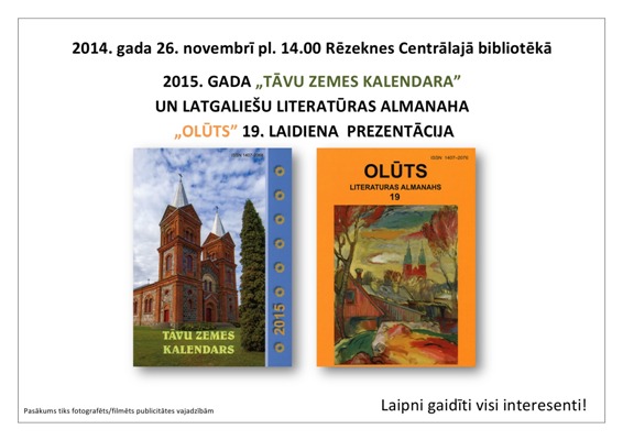 Šudiņ, 26. novembrī, 14.00 Rēzeknis Centralajā bibliotekā nūtiks kasgadejūs Latgolys Kulturys centra izdevnīceibys gruomotu “Tāvu zemes kalendars” i “Olūts” prezentaceja. Iz pasuokumu teik gaideiti vysi interesenti.