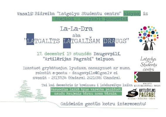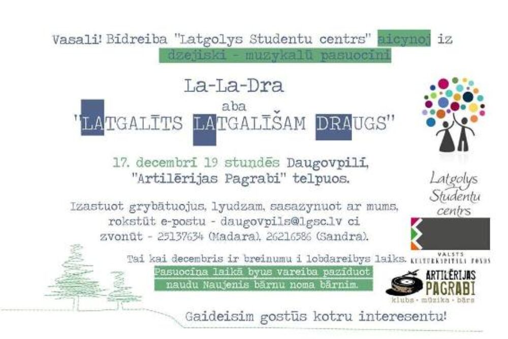 Bīdreiba „Latgolys Studentu centrs” aicynoj Daugovpiļs latgalīšus draudzētīs i 17. decembrī sasatikt dzejiski – muzykalā pasuocīnī Daugovpilī LaLaDra aba „LATGALĪTS LATGALĪŠAM DRAUGS”.