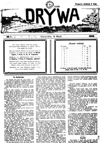 Karteņa: Gazetys “Drywa” pyrmais numers (pīejams: data.lnb.lv)