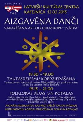 Daugovpiļs Latvīšu kulturys centrs i folklorys kūpa “Svātra” pavasara gaideišonys svātkūs – Aizgavienī – suoc jaunu pasuokumu cyklu “Vakariešona ar Svātru”, kurā, kūpā dorbojūtīs, kotrs sev var raudzeit atkluot latvīšu folklorys byuteibu, gudreibu i spāku. 12. februarī 18.30 Latvīšu kulturys centra kopejneicā (Reigys īlā 22a, Daugovpilī) teik reikuoti “Aizgavieņa daņči”.