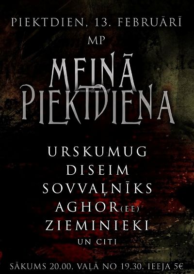 Pīktdiņ, 13. februarī, Reigā, klubā “Melnā piektdiena” (Breiveibys īla 193c) nūtiks metalistu saīts “Melnā piektdiena, 13”, kurymā uzastuos vairuoki muziki, tymā skaitā ari Sovvaļnīks.