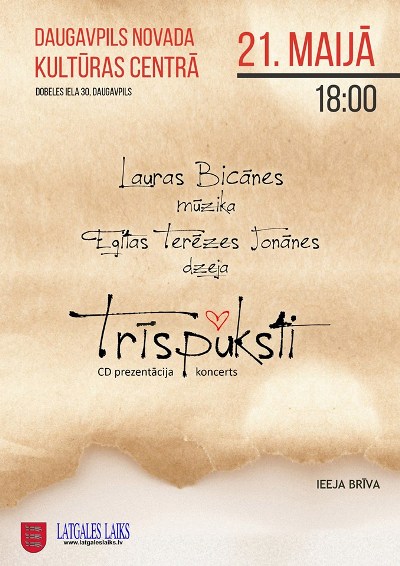 21. majā 18.00 Daugovpiļs nūvoda kulturys centrā paradzāts dzīsmineicys Laurys Bicānis ūtruo muzykys albuma “Trīspuksti” prezentacejis koncerts.