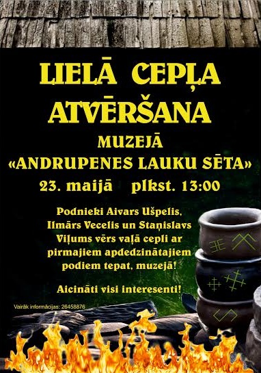 23. majā 13.00 muzejā “Ondrupinis lauku sāta” sevkurs aicynuots iz seņ gaideitū leluo pūdnīku cepļa attaiseišonu. Jaunū cepli vērs vaļā zynomī Latgolys pūdnīki – Aivars Ušpeļs, Ilmārs Veceļs i Stanislavs Viļums.