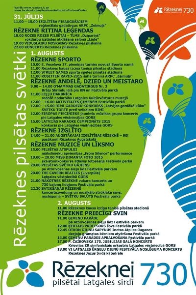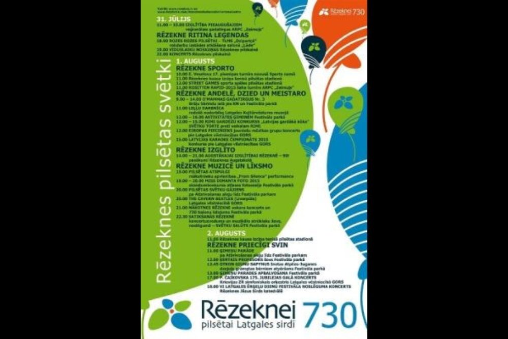Rēzekne itūgod svietej 730 godu jubileju, partū nu 31. juļa da 2. augusta vysi teik aicynuoti apmeklēt Rēzeknis piļsātys svātku nūtikšonys.