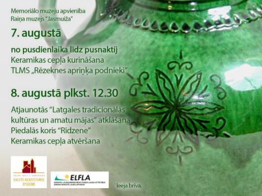 7. augustā Raiņa muzejs “Jasmuiža” aicynoj sevkuru interesentu pīsadaleit eistyna Latgolys keramikys molkys cepļa kūršonys pasuokumā. Jau nu reita pūdnīki nu TLMS “Rēzeknes apriņķa podnieki” rekonstruātajā Andryva Paulāna darbneicā glazēs i īliks ceplī sovus apdadzynuošonai sagataveitūs muola traukus. Ap pušdīņlaiku meistari cepli īkūrs i trauku apdadzynuošona turpynuosīs da diveju stunžu naktī. Sovukuort 8. augustā 12.30 ceplis tiks atvārts, i sevkurs interesents varēs vāruot vēļ korstūs muola trauku izjimšonu nu cepļa, kai ari nūsavērt i īsaguoduot kaidu īpatykušūs prīškmatu.