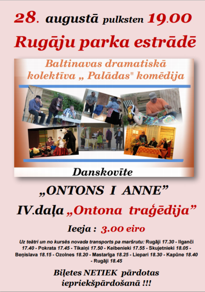 28. augustā 19.00 Ruguoju parka estradē tiks ruodeita Baļtinovys dramatiskuo kolektiva “Palādas” komedejis “Ontans i Anne” 4. daļa “Ontana tragedeja”.