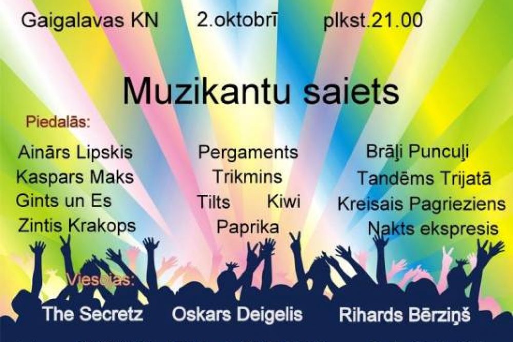 2. oktobrī 21.00 Rēzeknis nūvoda Gaigalovys kulturys nomā nūtiks jau par tradiceju palykušais Muzykantu saīts, kur pīsadaleis i apleicīnis muzykanti, i tuoluoki gosti.