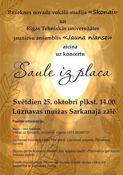 Svātdiņ, 25. oktobrī, 14.00 Lūznovys muižu rudineigi muzykaluos nūskaņuos īskandynuos Rēzeknis nūvoda vokaluo studeja “Skonai” i Reigys Tehniskuos universitatis jaunīšu vokalais ansamblis “Jauna Nianse” ar koncertprogramu “Saule iz placa”.