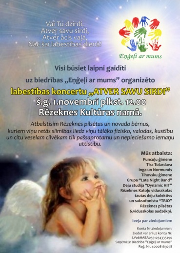 1. novembrī 12 stuņdēs Rēzeknis kulturys nomā (Bruoļu Skryndu īlā 3) bīdreiba “Eņģeļi ar mums” īlyudz iz labesteibys koncertu “Atver savu sirdi”, aicynojūt ar īīšonys zīduojumim atbaļsteit Rēzeknis piļsātys i nūvoda bārnus ar eipašom vajadzeibom, informej Rēzeknis Kulturys i Turisma centra puorstuove Maija Upeniece.