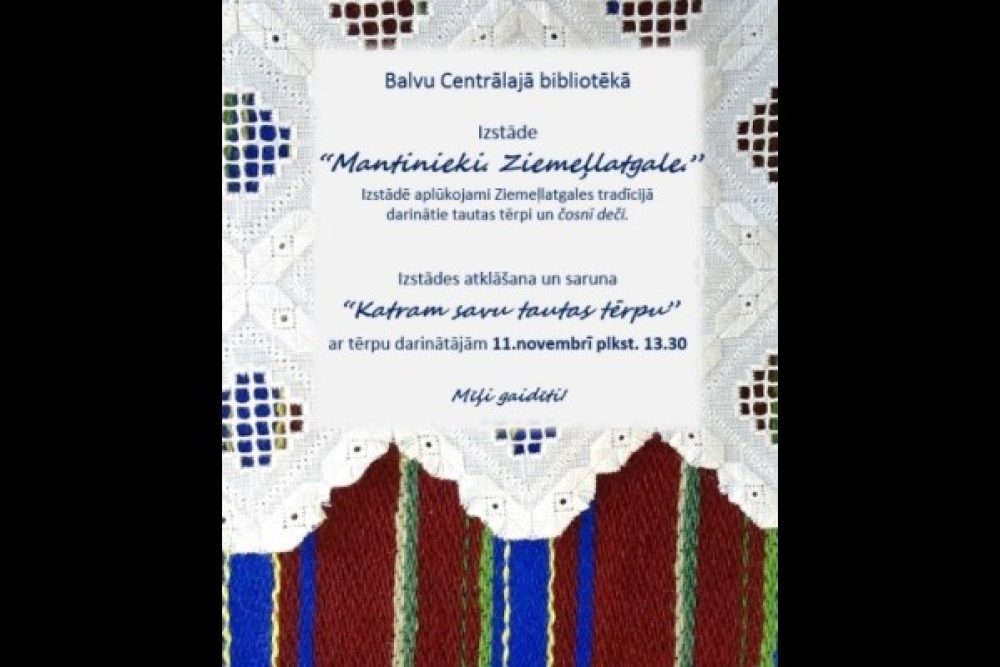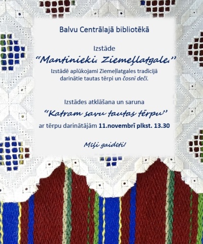 Bolvu Centralajā bibliotekā apsaverama Zīmeļlatgolys tautys tārpu i čosnūs deču izstuode “Mantinieki. Ziemeļlatgale”.