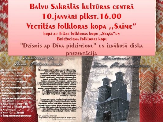 Taišni pyrma Zīmyssvātku aba Dīva Pīdzimšonys laika izguojs jauns vierteigs audio īroksts – albums “Dzīsmis ap Dīva Pīdzimšonu”, kuruo prezentacejis nūtikšona byus 10. janvarī Bolvūs. Albumā atrūnomys 14 senejuos katuoļu Zīmyssvātku dzīsmis, kuruos īdzīduojuse Vactiļžys pogosta folklorys kūpa “Saime”.