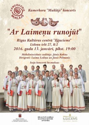 13. janvarī 19.00 Reigys dūmis kulturys centrā “Iļģuciems” kamerkors “Muklājs” īpazeistynuos ar izdūšonai sagataveitū latgalīšu dzīšmu albumu “Ar Laimeņu runojūt”. Koncertā tiks atskaņuotys albumā īraksteituos i cytys latgalīšu dzīsmis nu “Muklāja” repertuara.