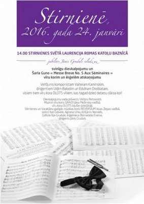 24. janvarī 14.00 Stiernīnis Svātuo Laurencija Rūmys katuoļu bazneicā nūtiks svineigs dīvkolpuojums i Šarla Guno “Messe Breve No.5 Aux Séminaires” veiru koram i varganem atskaņuojums jubilara dirigenta Juoņa Gruduļa vadeibā.