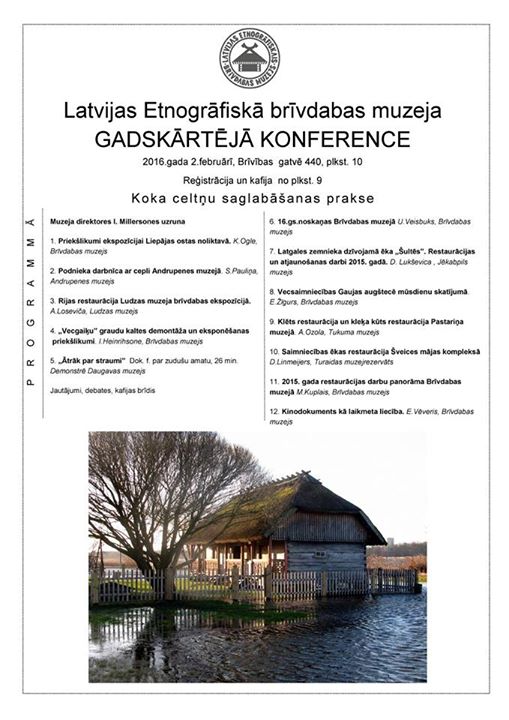Konfereņcē S. Pauliņa (Ondrupinis muzejs) stuosteis par pūdnīka darbneicu ar cepli Ondrupinis muzejā, A. Loseviča (Ludzys muzejs) referēs par rejis restauraceju Ludzys muzeja breivdobys ekspozicejā, sovukuort D. Lukševicys (Jākubpiļs muzejs) referats byus par Latgolys zemnīka dzeivojamū kuormu “Šultēs”, tuo restauracejis i atjaunuošonys dorbim 2015. godā.
